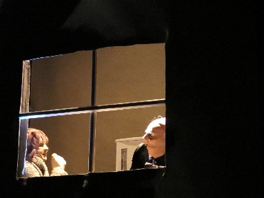 Il loro ultimo lavoro è costruito sul primo testo teatrale di Harold Pinter, premio nobel per la letteratura e grandissimo autore teatrale nel Novecento che ha portato il linguaggio, sulla scia di Beckett e della drammaturgia dell’assurdo, ai suoi confini più estremi. Il testo messo in scena è “La stanza”: un dramma tragicomico costruito intorno alla figura di Rose e ai suoi incontri. La stanza in cui è ambientato il dramma diventa in questa versione un piccolo spazio che il pubblico spia da una sola piccola finestra: vediamo solo ciò che la cornice dell’infisso ci permette di vedere, dirimpettai serali che spiano un interno. Intravediamo solo una stufa e indoviniamo (e immaginiamo) un tavolo, dei fornelli, delle ante, una sedia a dondolo. Le voci degli attori sono amplificate, come se sempre noi, spioni della casa di fronte, avessimo piazzato una cimice nella stanza. L’amplificazione confonde, non permette di avere la direzione della voce, e quindi permette ai due attori di impersonare tutti e sei i personaggi del dramma, cambiando tono, timbro e fisionomia, muovendo oggetti al di fuori della finestra che noi vediamo…
